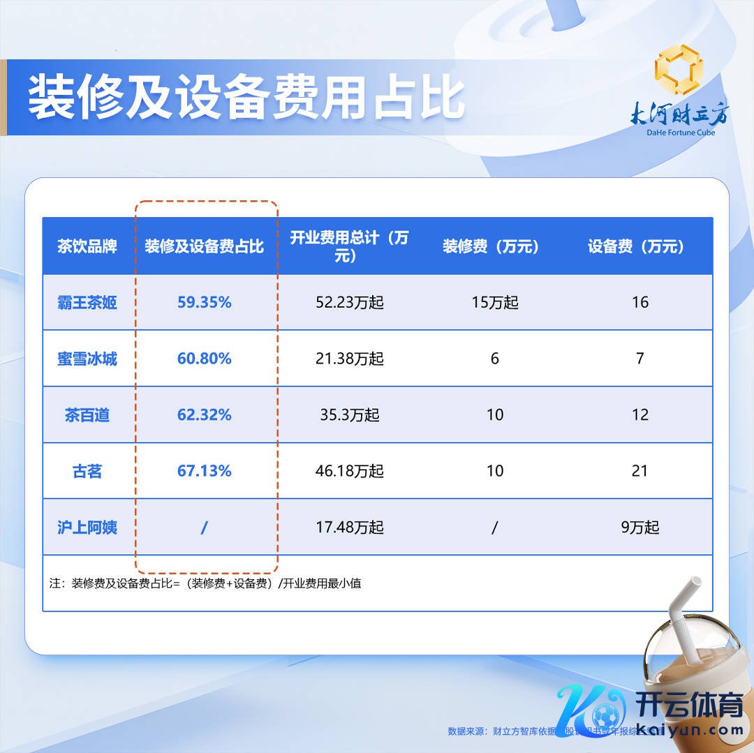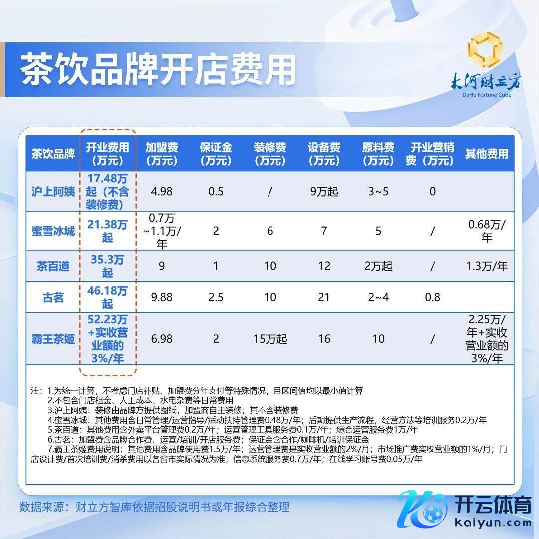 大河财立方智库最新磋议回报自大,由于品牌定位、耗尽客群、客单价等均有不同,茶饮店首批参预用度(不含房钱、东说念主工等平方筹办性开销)也有较着各异。举座来看,平价品牌蜜雪冰城等参预本钱较低;中端品牌中,古茗以46.18万元居首;霸王茶姬开业本钱冲破50万元。(注:磋议数据来自品牌官网或加盟手册,不筹议分期、补贴等身分,为最低开业用度。)