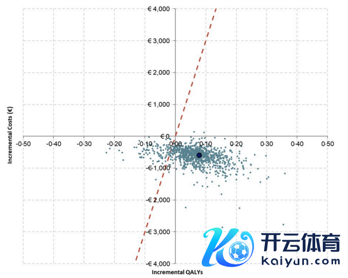 图3:大多数迭代扫尾落在平面的东南象限,低于每增多一个质地调理生命年所需钱数的阈值