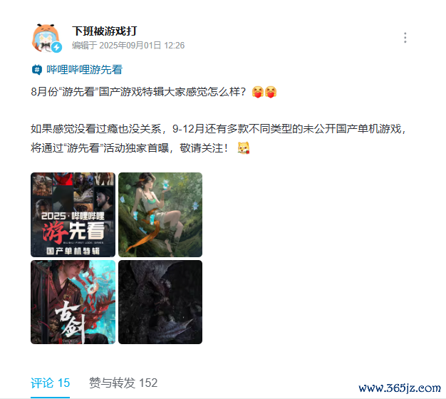 B站游戏区官方账号“放工被游戏打”发布动态通知云开体育,往时9-12月将公开更多国产单机游戏。
