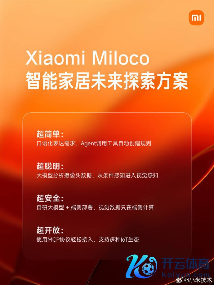 据先容,Miloco 全屋智能相反化体验,来自 Xiaomi MiMo-VL-Miloco-7B 端侧视觉话语大模子与四层竣工架构的撑捏,从交互、感知、生态、安全四个维度优化全屋智能的交互逻辑与膨胀智商。