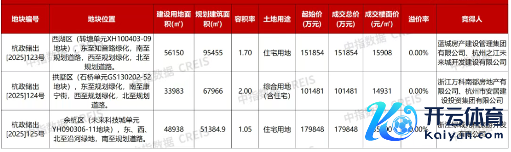 11月25日,浙江省杭州市成交三宗住宅用地,辞别位于西湖区转塘单位、拱墅区石桥单位和余杭区往常科技城单位,总用大地积13.91万平素米,总道路建筑面积21.48万平素米,成交总数43.32亿元。