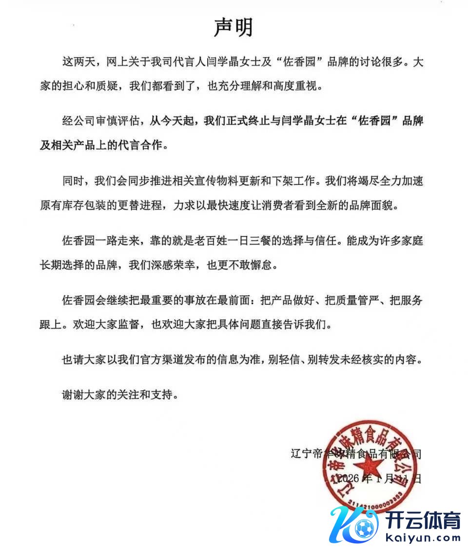【大河财立方讯息】1月11日开yun体育网,辽宁帝华味精食物有限公司通过视频号发布声明称,这两天,网上对于公司代言东谈主闫学晶女士及“佐香园”品牌的征询好多。民众的惦念和质疑,咱们皆看到了,也充分连气儿和高度醉心。