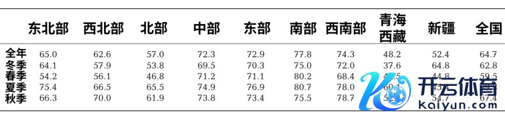 在1961年到2018年这段时辰,我国的年平均湿度从西北部到东南部渐渐升高。到了冬天,东部、南部、西南部的平均相对湿度高达70%以上,而西北、东北、北部地区在65%以下。